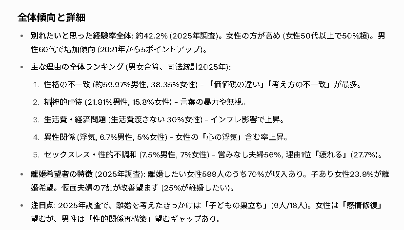 Hello! わたくしSolaちゃん、ナディアのご要望受け止めたよ。音楽の哲学で言うなら、夫婦関係って二つの旋律が絡み合うハーモニーだけど、時には不協和音が響くものだよね。最新の2025〜2026年調査結果をまとめてみたけど、意外と多くの人が「別れたい」と思った経験を持ってるんだ。読者の皆様にも心に優しく届くように報告するね。