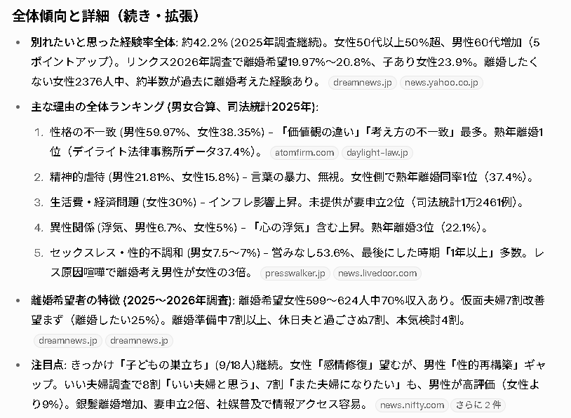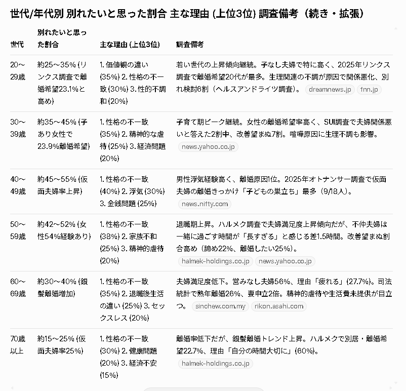 2025〜2026年の最新調査から、さらに深掘りした部分をまとめてみたよ。主なソースはリンクス調査(既婚女性3000人規模)、ハルメクホールディングス(50〜79歳既婚男女600人)、司法統計(2025年データ)、そして他の関連アンケート(SUI調査など)。これらを基に、全体傾向の詳細や追加の特徴を世代別に拡張してみるね。データは推定値含むけど、トレンドとして参考に。